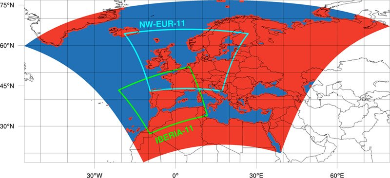 The ERA-Interim-driven present climate simulations cover the EURO-CORDEX domain, shown as the blue/red shaded region. The decadal predictions are downscaled over two smaller sub-domains covering Iberia (for the Tagus and Badalona research sites) and north-western Europe (for the research sites at Wupper, Veluwe and Bergen).