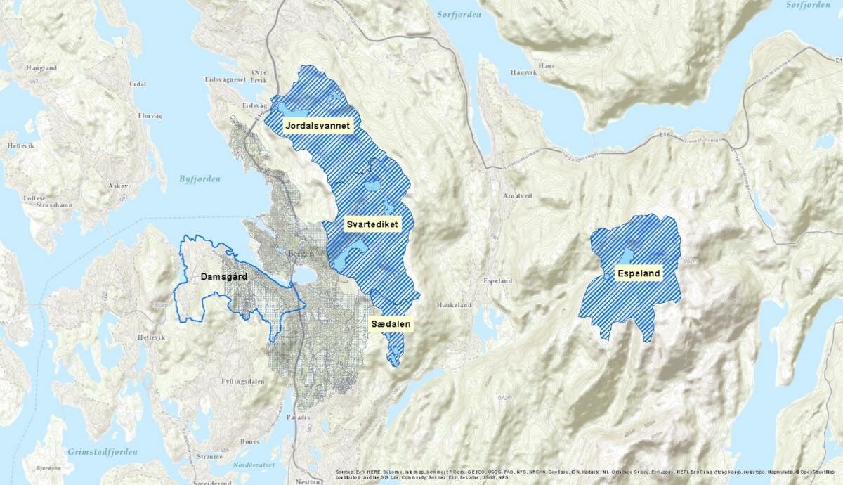 Figure: Map of the Bergen research site showing main drinking water reservoirs (Jordalsvannet, Svartediket, Sædalen, Espeland) and area with combined sewer system (Damsgård).